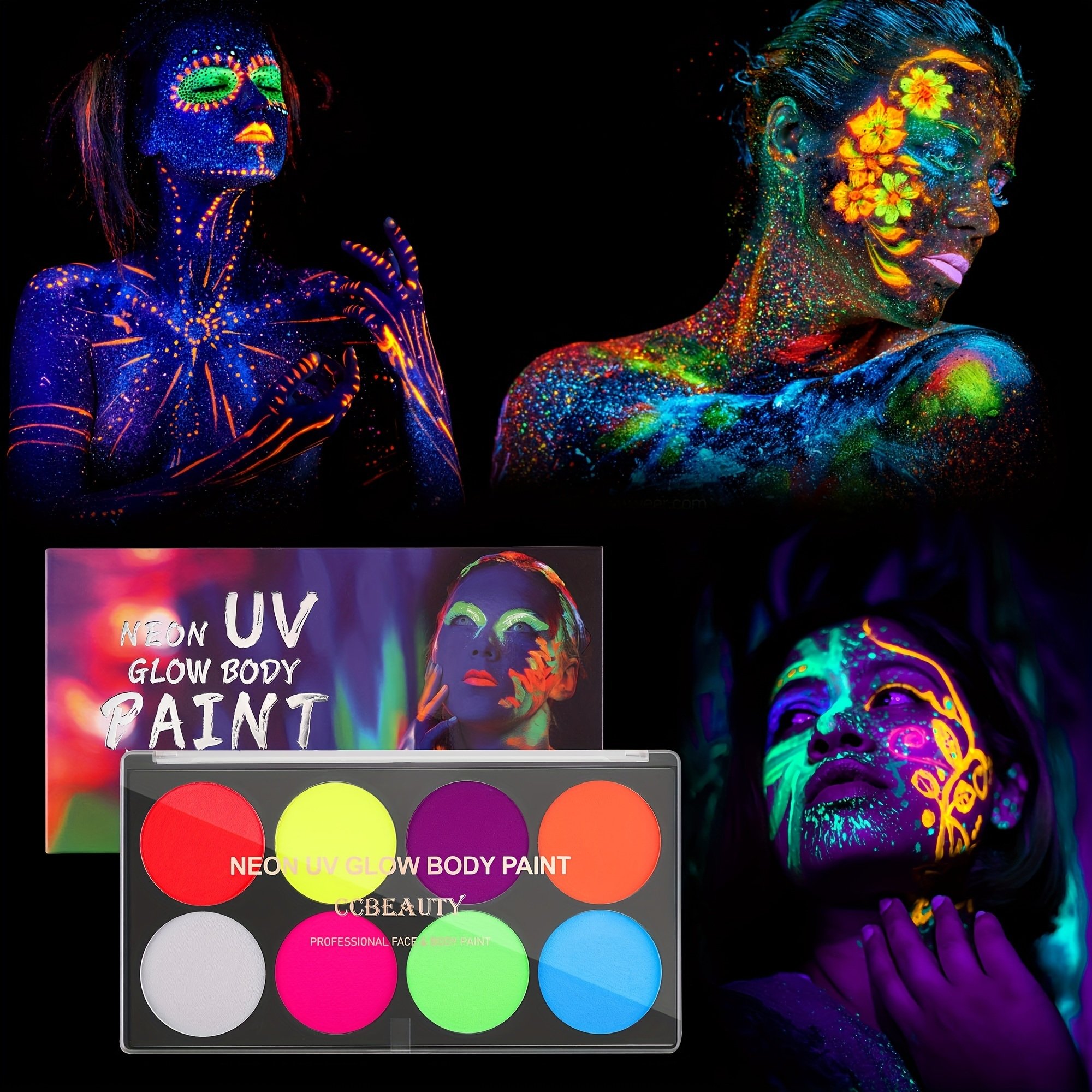 Home > CC Beauty UV Glow Face Body Paint Palette, 8 Neon Glow In Black Lights Face Paint Kit, Water Activated Eyeliner, Safe Washable Adult, Halloween Makeup