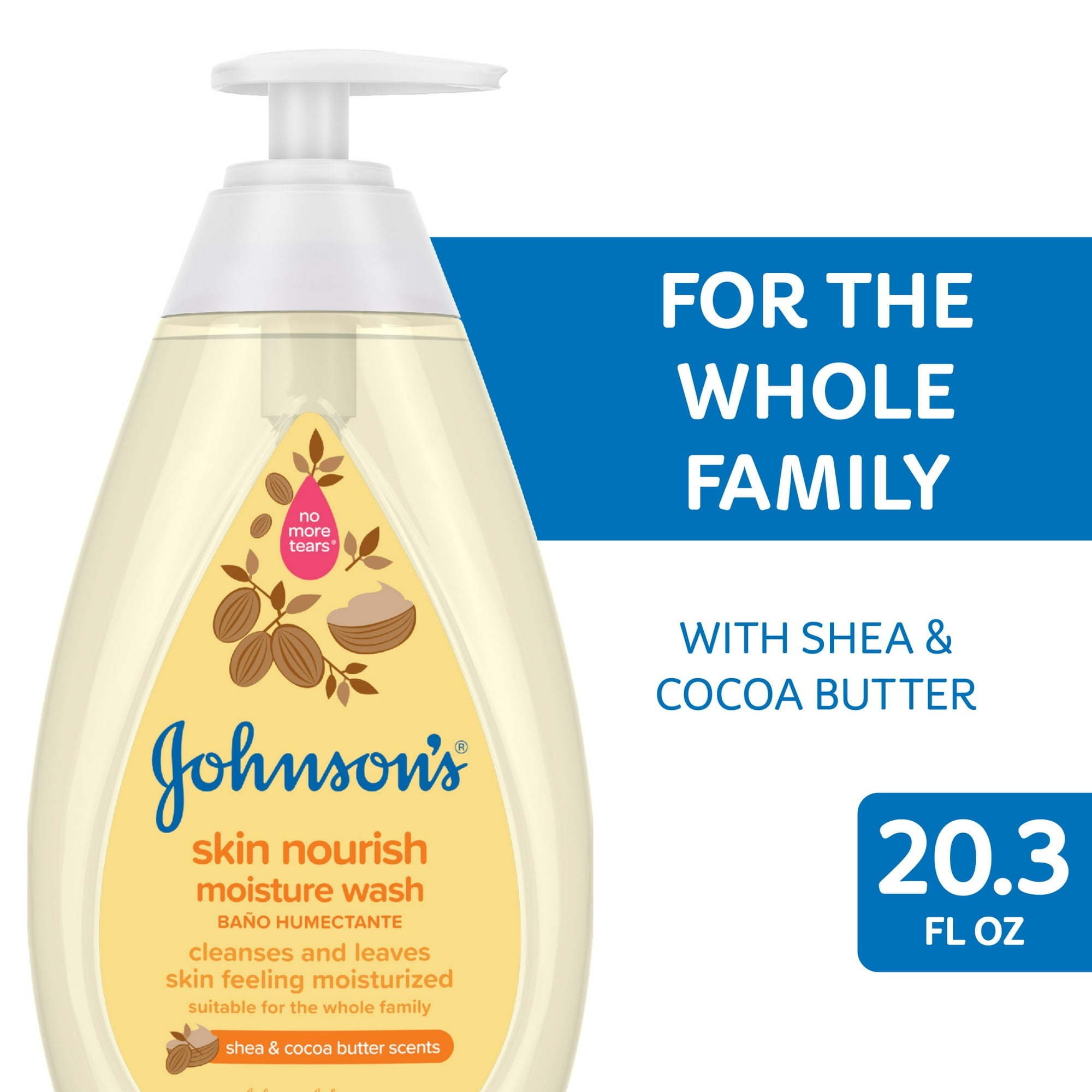 GGently cleanse your baby's delicate skin and hair with Johnson's Skin Nourish Moisture Shea & Cocoa Butter Baby Body Wash. This gentle moisturizing bath wash contains shea and cocoa butter. Suitable for babies, kids and adults, the body wash is designed to cleanse and leave skin feeling moisturized and touchably soft and smooth. Enriched with 2x more moisturizers* and a gentle scent, 95% agree that skin felt moisturized after use. This baby wash has a No More Tears tear-free formula that's as gentle to the eyes as pure water. Formulated to be gentle, never harsh, the hypoallergenic baby bath wash is dermatologist and pediatrician tested and contains no parabens, phthalates, sulfates, or dyes. To use, wet baby's body with warm water, apply wash with your hand or washcloth, gently lather, and rinse. For best results, use with Johnson's Skin Nourish Lotion. *Vs. Johnson's Bedtime Bath