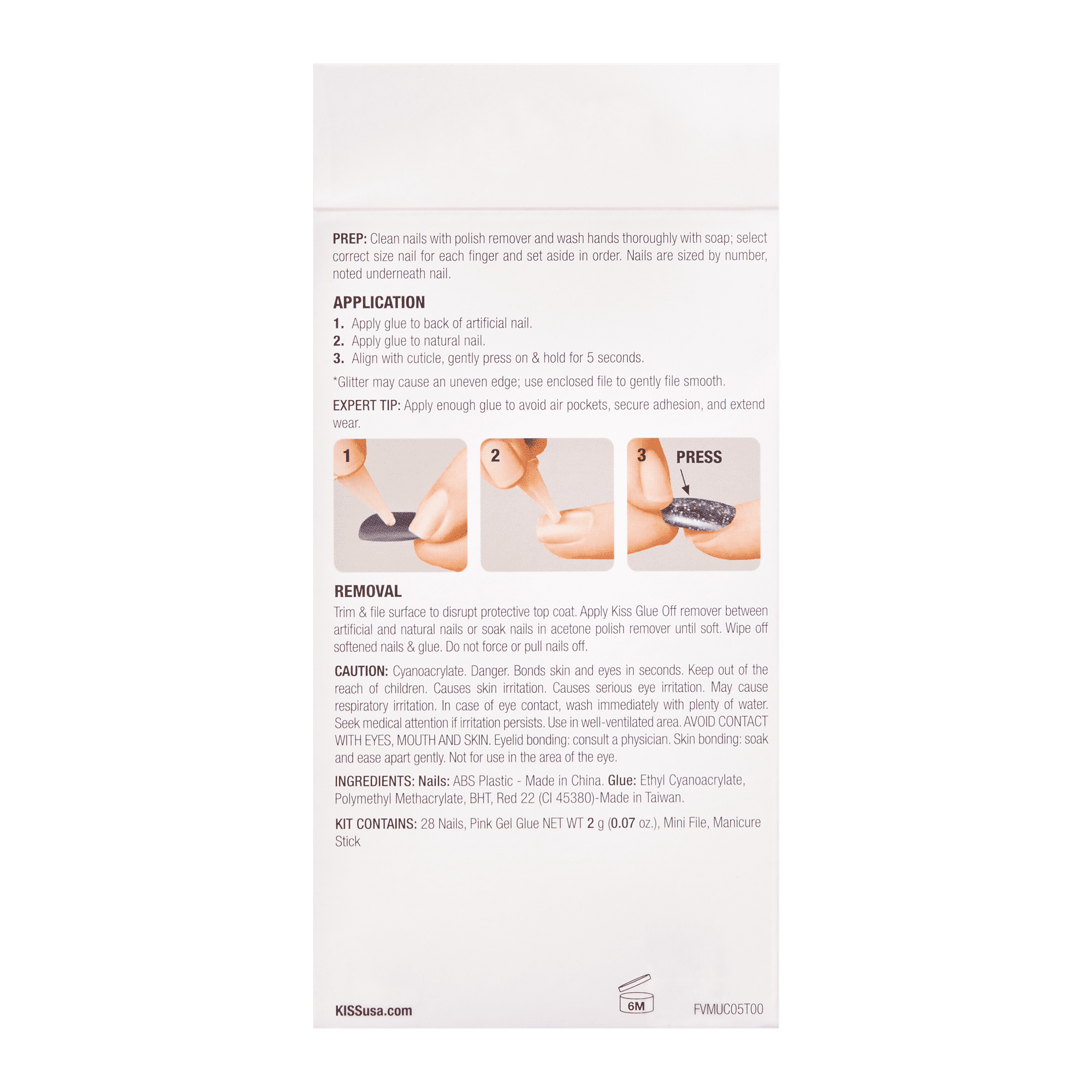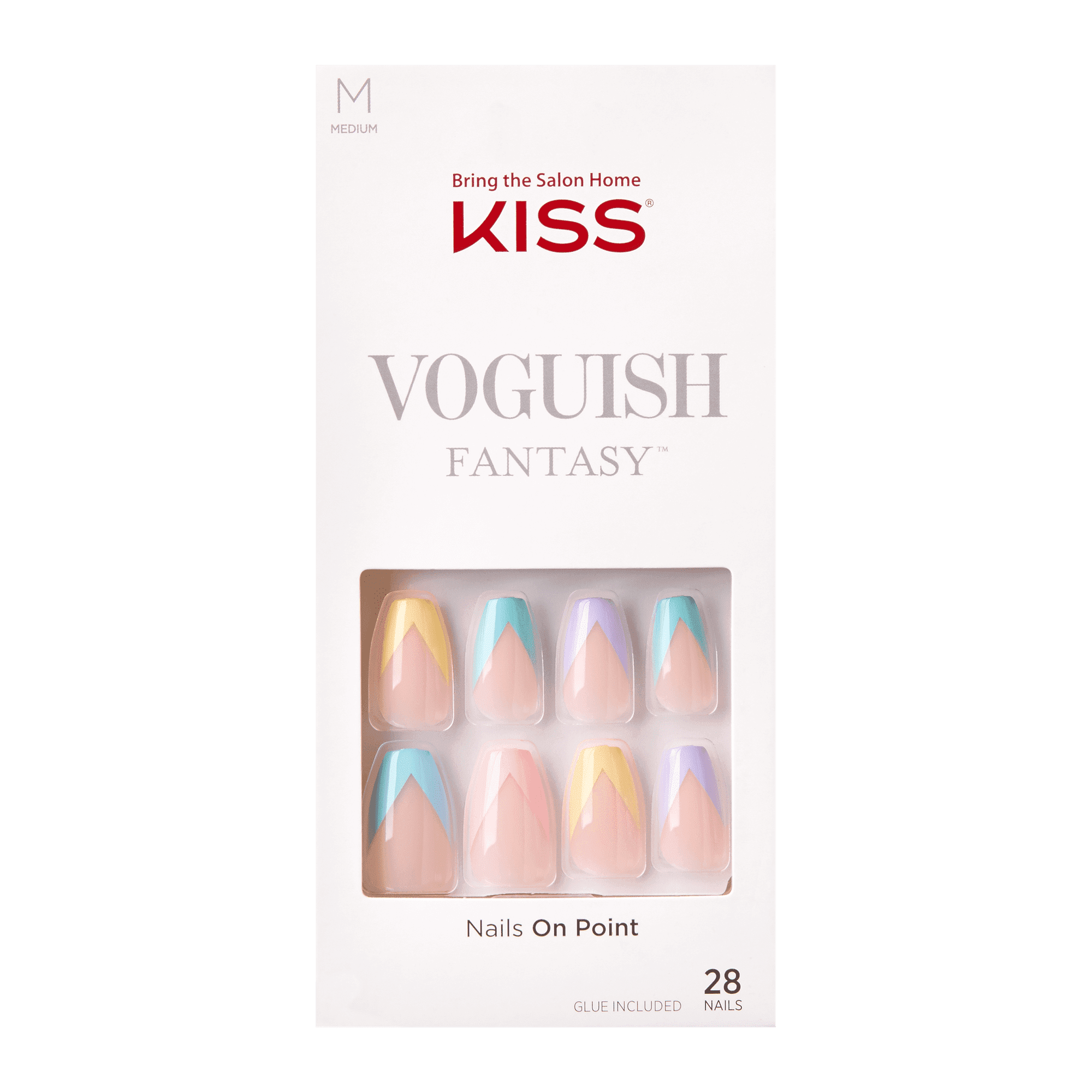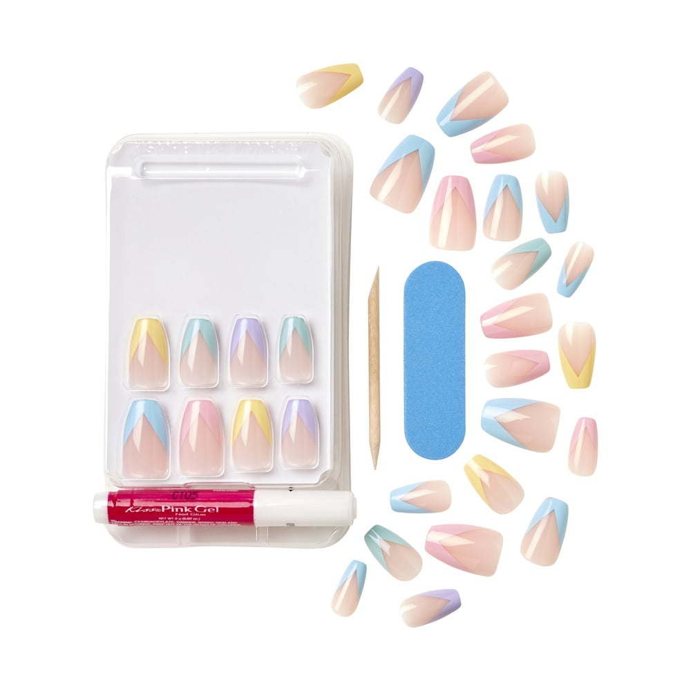 Wear the latest trends on your fingertips with KISS Voguish Fantasy Fake Nails! Go vogue with tie-dyed, ombre, multicolor, and marble acrylic nail art designs. Ready-to-wear gel nails in minutes lasts for up to a week, and designed for all manicure fans! It's so easy to do your own mani in minutes, with results that look natural and a comfortable fit that feels just like your own nails. The acrylic false nails come ready to wear, no polish is required, they're waterproof, they have a smudge-free gel finish that stays perfect, and no nail polish drying time is needed. The fake nails are hassle-free to remove, and they don't damage your natural nails. DIY nail kit contains everything you need for an at-home manicure: 28 fake nails, pink gel glue net wt. 2g (0.07oz.), prep pad, mini file, and manicure stick.